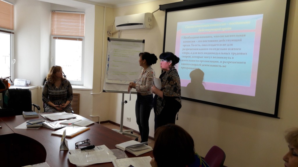 Семинар барысында тақырыпқа сай ҚР-ның ЕК-інде берілген159-161бапты негізге алу, ұжымдық шарттың №2 қосымшада нақты көрсете отырып кең көлемде түсініктер берілді және семинардың 2-бөлімінде осы алған түсініктерін шыңдау мақсатында қатысушыларды 4-топқа бөліп еңбек дауларына байланысты тапсырмалар берілді. Әр топ өз тапсырмаларын топ алдында қорғап көрсетті.