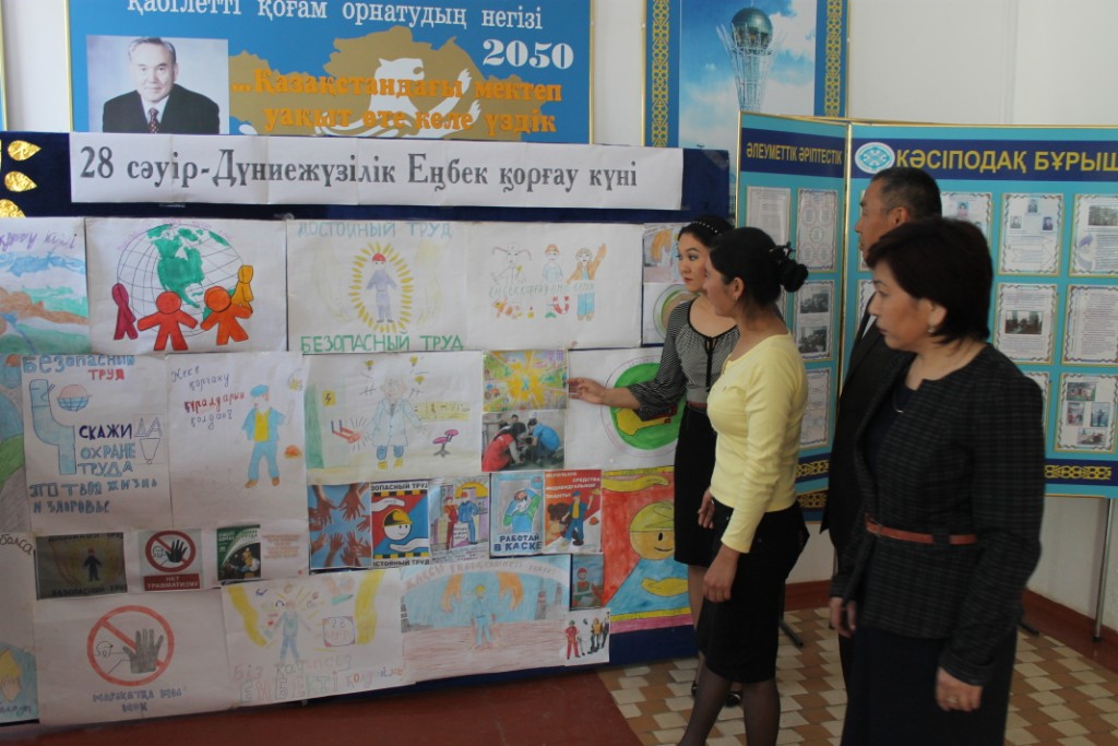 Мектеп ұжымы арасында еңбек шарты және «Дүниежүзілік Еңбек қорғау күні» атты баяндама жасалып,талқыланды.Баяндама барысында кәсіптік тәуекелдердің белгілерін анықтау, олардың жұмыс істеушілерге әсер ету деңгейін зерттеу, жұмыс істеушілердің еңбек жағдайы мен денсаулығына мониторинг, жазатайым оқиғалар мен кәсіптік ауруларды зерттеу және басқа да мәселелер кәсіптік тәуекелдерді бағалау қатарына кіретіні жайлы айтылды.