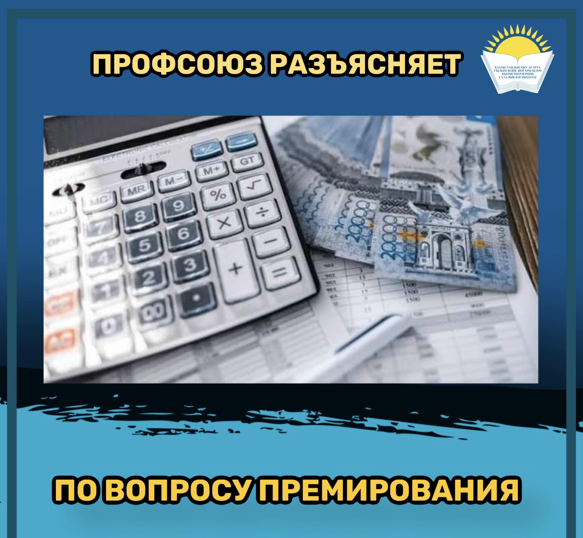 В профсоюз отрасли поступает много обращений от педагогов касательно премирования. В связи с этим размещаем следующее разъяснение: В соответствии с п.3 ст.107 Трудового кодекса РК для усиления повышения заинтересованности работников в увеличении эффективности производства и качества выполняемых работ работодателем могут …