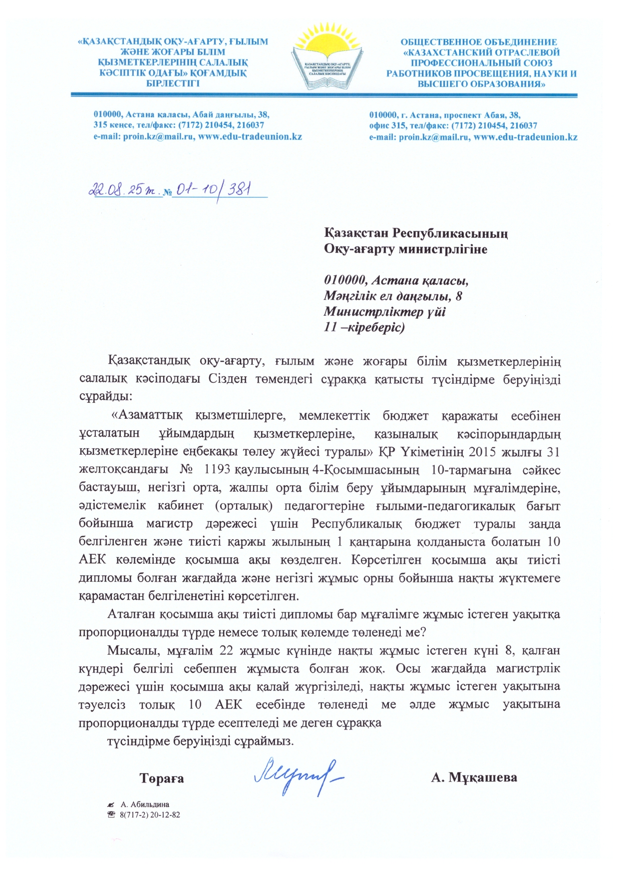 Салалық кәсіподақтың әлеуметтік желілердегі парақшаларына мұғалімдерден жаңартылған білім беру мазмұны үшін берілетін қосымша ақы - базалық лауазымдық ақының, яғни 17 697 теңгенің 30% құрайтыны туралы жазылған сауалдарына қатысты келесі түсіндірме беріледі. Ұйымдық-құқықтық нысаны мемлекеттік мекеме, қазыналық кәсіпорын қызметкерлерінің айлықақы, қосымша …