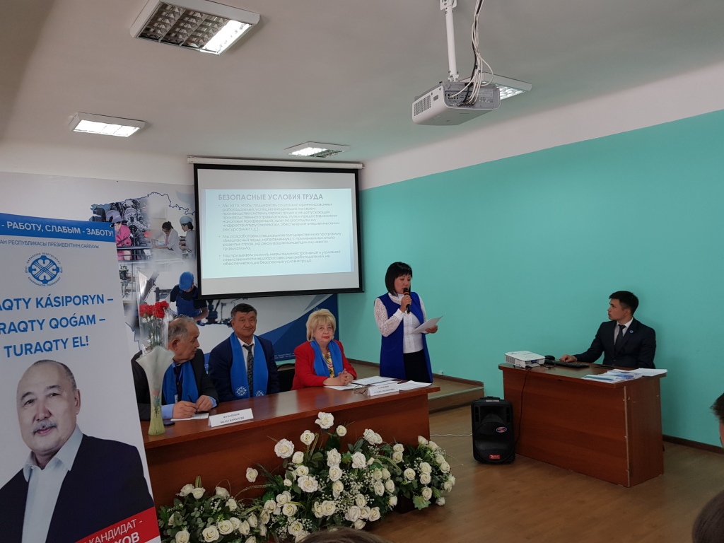 Со словами поддержки кандидата выступили Абдикаримова А.О. – председатель ППО «Школа- Лицей №9» г.Темиртау, Адамбай Г.Б. – председатель ПК СОШ №52 /Казыбек би/, Бугубаева Д.Д. – председатель ПК д/сада «Алданыш» г.Караганды, Саккулакова Ф.Д. – социальный педагог СШ №1 Осакаровского района, Бем О.А. – председатель профкома Петровской СШ Бухар жырауского района, Акижанов М.А. – зам.председателя Нуринской профсоюзной организации, Толеуханова А.Е. – председатель профкома Каркаралинского районного отдела образования, Ульянов А.А. - председатель Саранского филиала Профсоюза работников образования и науки, Рудюк С.В. – методист отдела образования Абайского района доверенное лицо Таспихова А., Балапанова А.Б. – член Исполкома Шахтинской районной профсоюзной организации. Выступающие отметили основные аспекты предвыборной платформы кандидата в Президенты РК Таспихова А. - усиление ответственности недобросовестных работодателей, безопасные условия труда, обеспечение трудовых прав работников, достойная оплата труда, регулирование трудовой миграции, качественное и бесплатное образование.